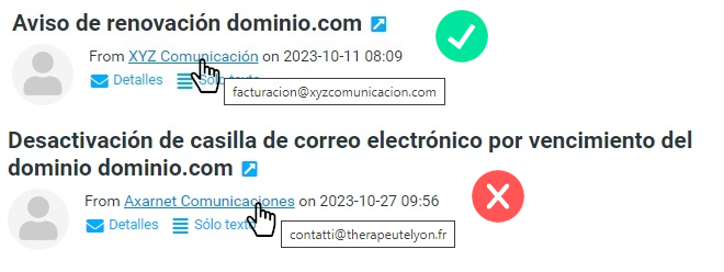 Para comprobarlo, simplemente pasa el ratón por encima del remitente. En algunos gestores de correo directamente te muestra el email al lado.